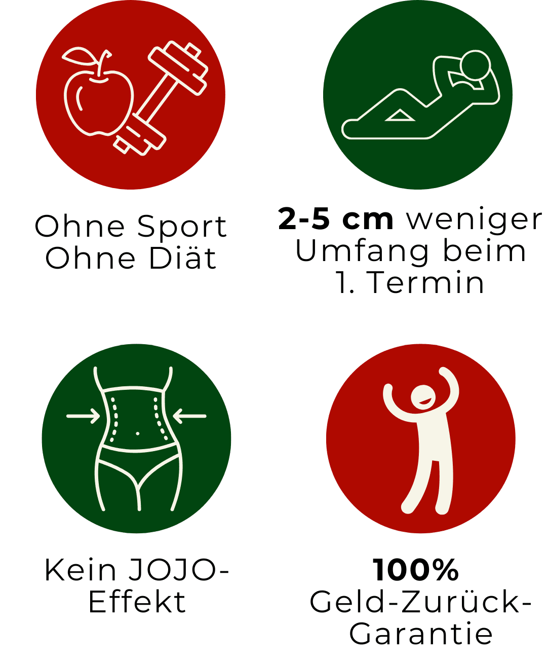 Wir garantieren dir 2-5 cm Umfangsverlust bereits nach der Probebehandlung. Sollte dieses Ergebnis nicht eintreffen greift die Geld-Zurück-Garantie und du bekommst sofort den vollen Preis der Behandlung zurück erstattet.